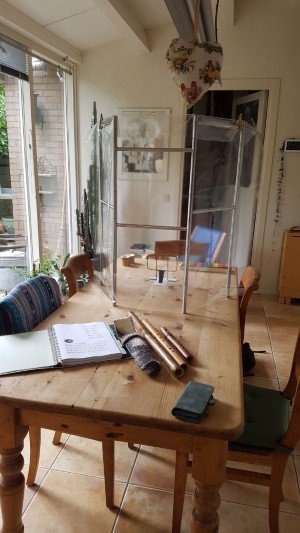 - Er hangt een groot plastic scherm in mijn lesruimte. De tafel staat daar voor een deel onder zodat ik aan de ene kant, de leerlingen aan de andere kant van het scherm zitten. Het scherm hangt zodanig dat mijn handen er onderdoor kunnen om de kinderen te helpen met b.v. boren (vasthouden van de fluit)