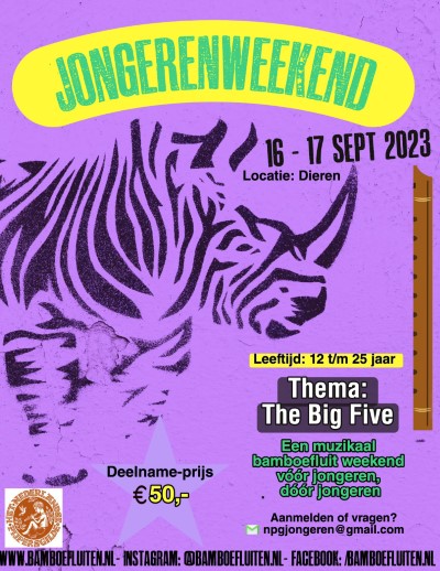 In het weekend van 16 en 17 september is er weer een weekend gepland, ditmaal met het thema "The big five"! Speciaal voor iedereen tussen 12 en 25 jaar, die zin heeft om lekker muziek te maken.