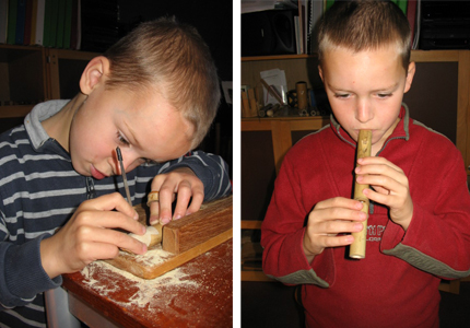 Wanneer het eerste gat is geboord en gestemd (zie Bouwen) kun je liedjes van twee tonen spelen. Meteen oefen je de grepen van deze twee tonen, zonder dat je al heel veel gaten hoeft dicht te houden. Dit is een groot voordeel vergeleken met bijvoorbeeld een blokfluit.